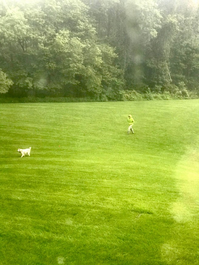 A cloudy evening, light drizzle. At a distance, a man in a green rain jacket is out for a walk with his dog. Patiently, he follows and watches his enthusiastic dog sniff the ground, play in the wetness of the green grass, and run around.