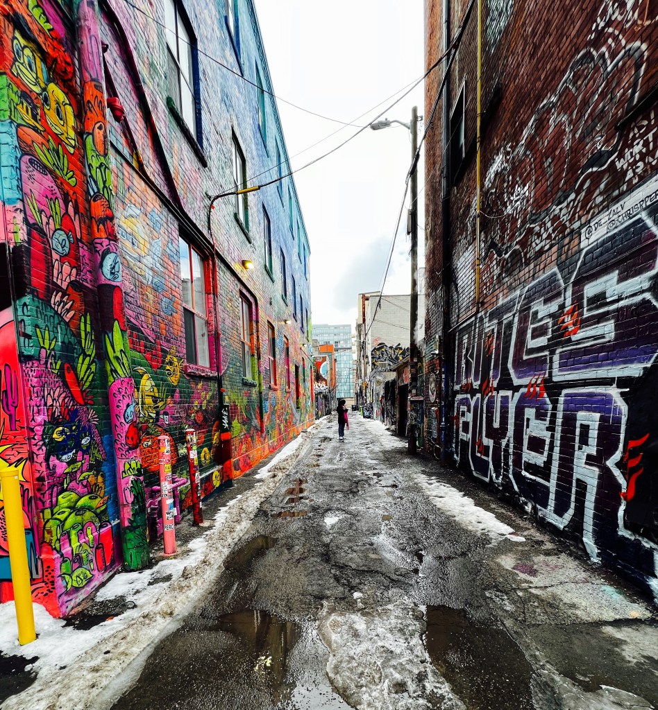 6. Graffiti Alley: In the alleyway between Queen and Richmond Street, you can will find city blocks adorned with vibrant street art and murals. Street art is a form of art that is publicly displayed on buildings or doors, showcasing an artist’s personal artwork or spreading awareness about social and political issues. Though street art is often done illegally, Graffiti Alley in Toronto is a legal street art alley. If you haven’t seen street art before, you’ll find this stretch of alley truly amazing. Don’t forget your camera; you can capture some fantastic photos.