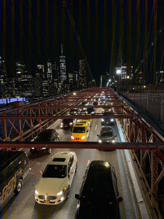 The walk from Brooklyn to Manhattan across the Brooklyn Bridge is a memory for a lifetime. Manhattan in New York City sparkles like a million scattered diamonds at night. Each light from the skyline was trembling across the water on that freezing winter evening as the wind cut sharply through us, but every step was worth it. The image below does not do justice to reality.