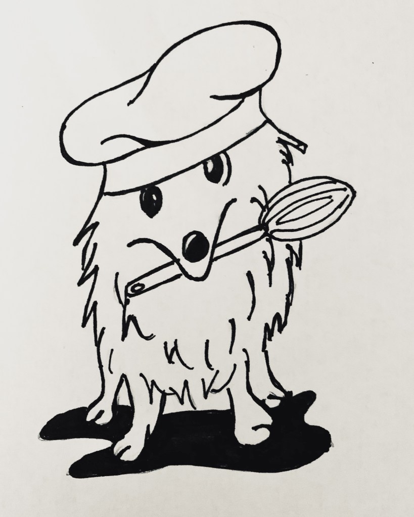 “Who says cookin is just for hoomans?”, says the pupper chef. He turns around to grab a whisk in his mouth, puts on the chef hat and makes your heart melt.