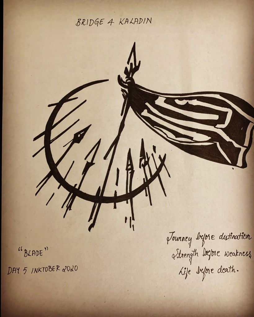 When I saw Blade as day five’s Inktober prompt, the first thing that came to my mind was Shardblade. The Stormlight Archive is one of the best fantasy book series and Kaladin is my favorite character! This sketch is the chapter art for Kaladin and I always wanted to attempt drawing this.